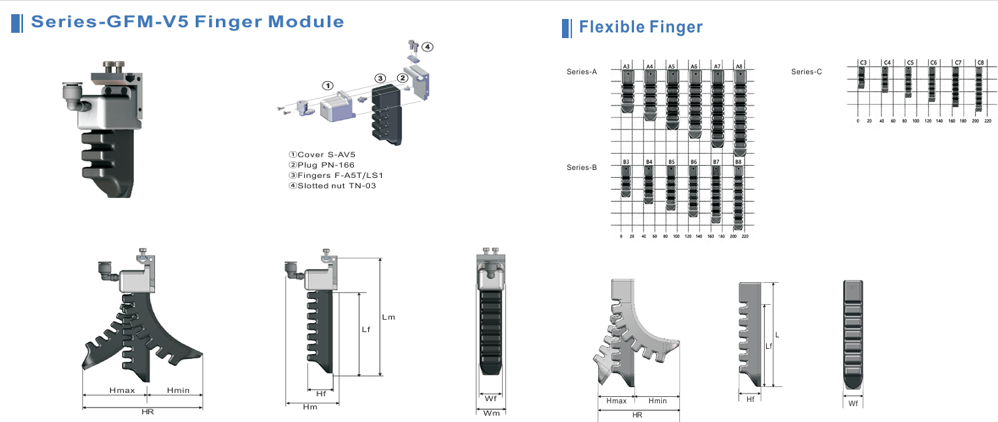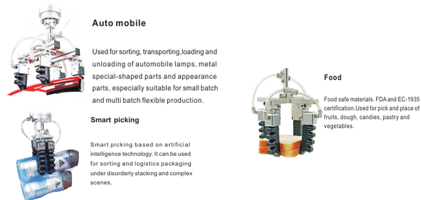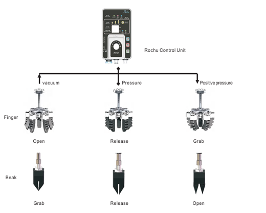Rochu Gripper ปากจับแบบนิ้วจับหรือ แบบหนวดปลาหมึก เป็นรูปแบบการจับงานที่พัฒนามาจากการ จับยึดของปลาหมึก หรือการงอนิ้วมือเพื่อรัดวัตถุ ให้แน่น โดยการออกแบบ จะใช้แรงดันลมอัดและแรงดูดสูญญากาศ เพื่อทำให้ ปากจับ งอเข้ารัดชิ้นงานหรือ ดัดดออกเพื่อขยายรัดชิ้นงาน โดย มีชนิดของปากจับ อยู่สองแบบ คือ แบบ Finger & Beakสามารถนำไปหยิบจับชิ้นงานที่มีรูปทรงไม่สมมาตร มีพื้นผิวบอบบบาง วัสดุที่ ปากจับประเภทปกติไม่สามารถหยิบจับได้ แรงบีบจับสมารถควบคุมได้ มีหลากหลายรูปแบบหน้าตาและมีขนาดให้เลือกมาก ขึ้นอยู่กับรูปทรงและพื้นผิวที่เราต้องการนำไปใช้