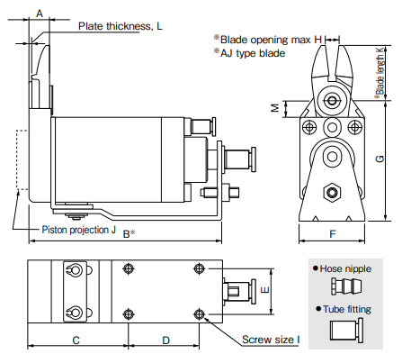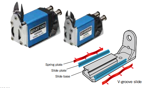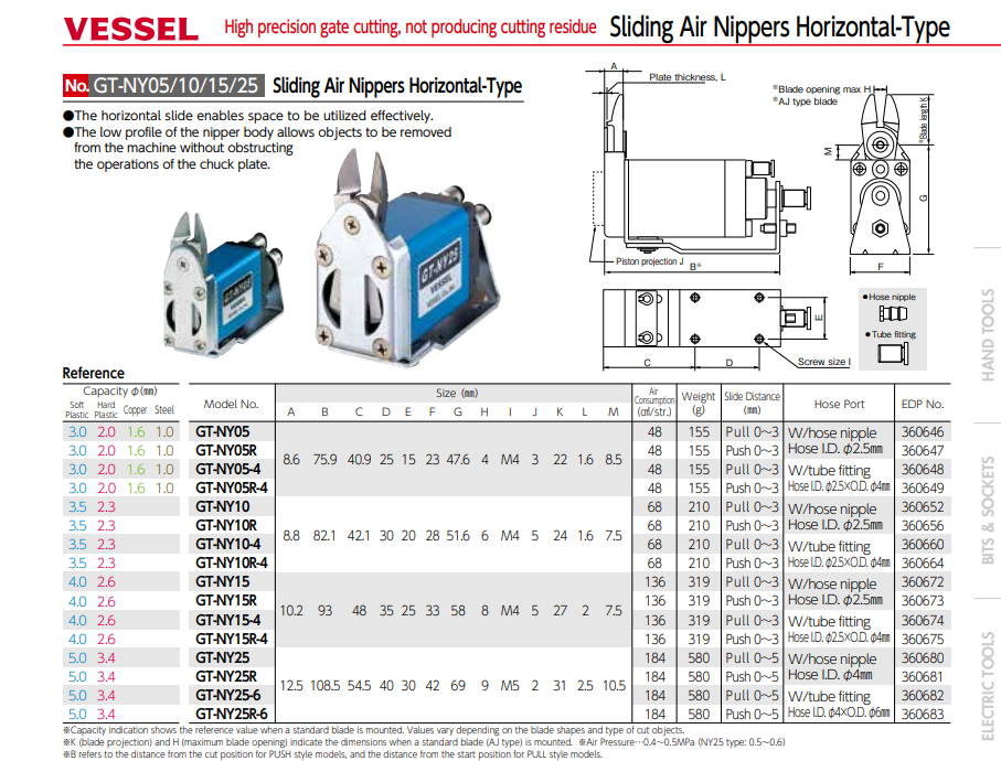 กรรไกรลม (แบบขนาดมาตรฐาน) สำหรับงานพลาสติก ประเภทสไลด์แนวนอนที่สามารถติดตั้งง่ายในทุกมิติ แนวตั้ง แนวนอนขนาดกะทัดรัดน้ำหนักเบาและเหมาะสำหรับติดตั้งรวมกับ เฟรมอลูมิเนียมบนแขนเครื่องจักร หรือบนอุปกรณ์ยึดจับที่มีพื้นที่น้อยเนื่องจากตัว กรรไกรลม มิติตัวำม่กว้างความสูงตัวน้อยกว่า จึงติดตั้งโดยไม่ติดขัดการทำงาน หรือเป็นอุปสรรคอุปสรรคต่อการทำงาน ของชุดหัวจับชิ้นงาน